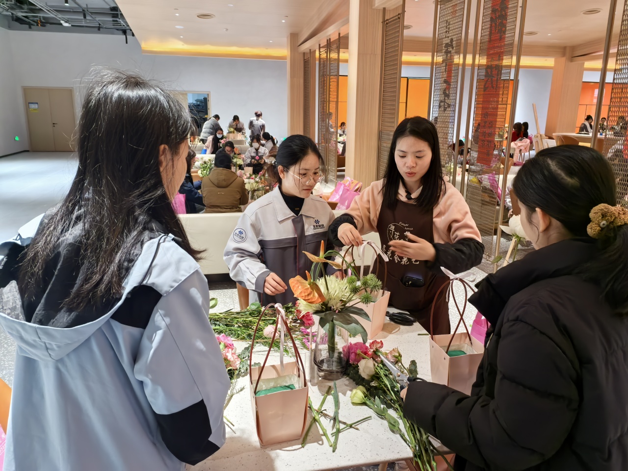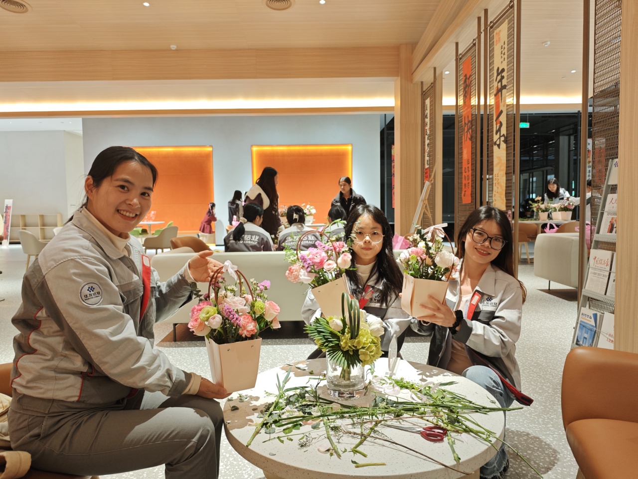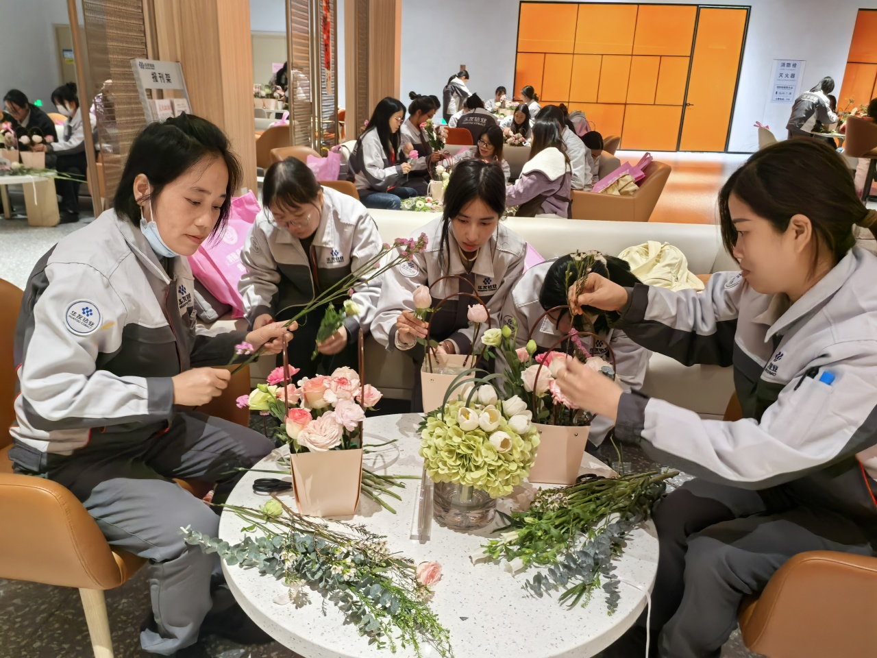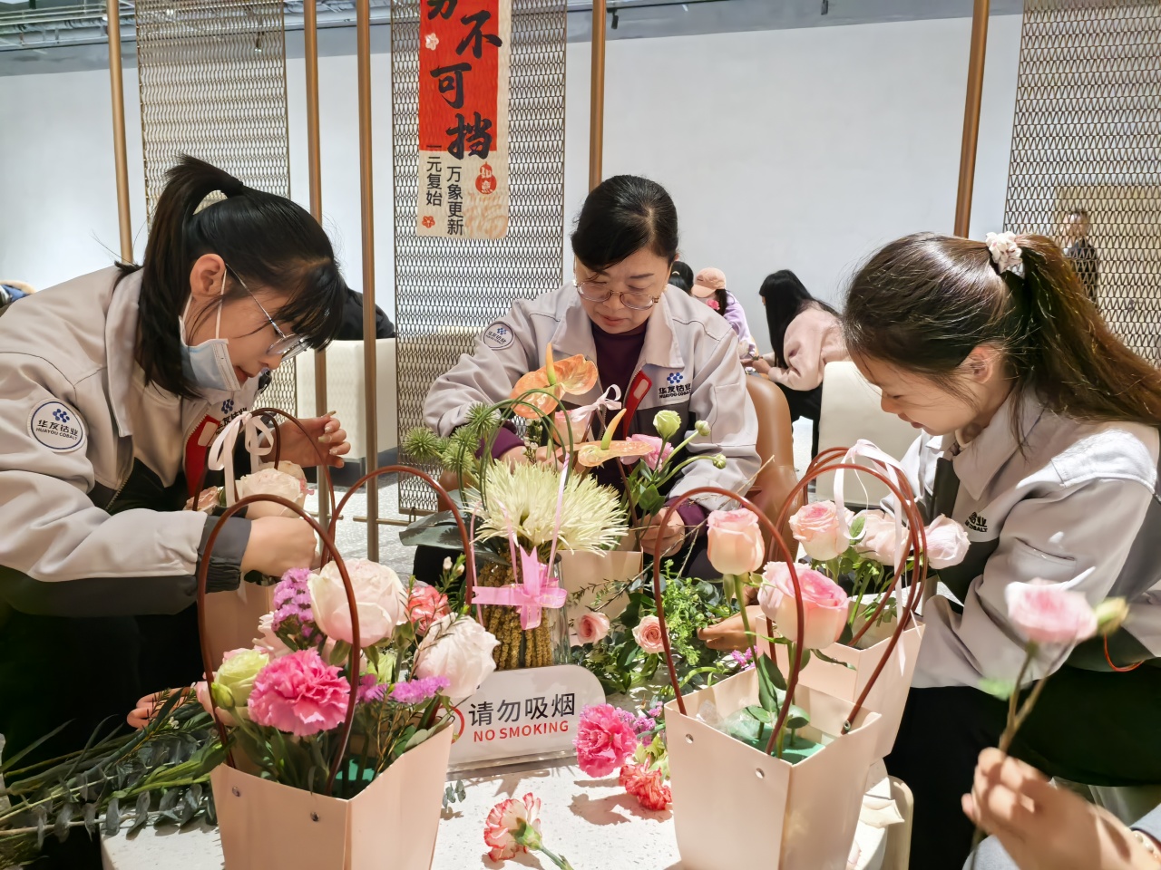 健康講座結束后,員工們在花藝師指導下進行春日主題插花創作。拆開春日花材包的那一刻,商超休閑中心化作花香彌漫的創作空間。康乃馨的溫柔、洋桔梗的靈動、尤加利葉的堅韌…… 每一束花籃都是職場女性多重角色的生動寫照。
