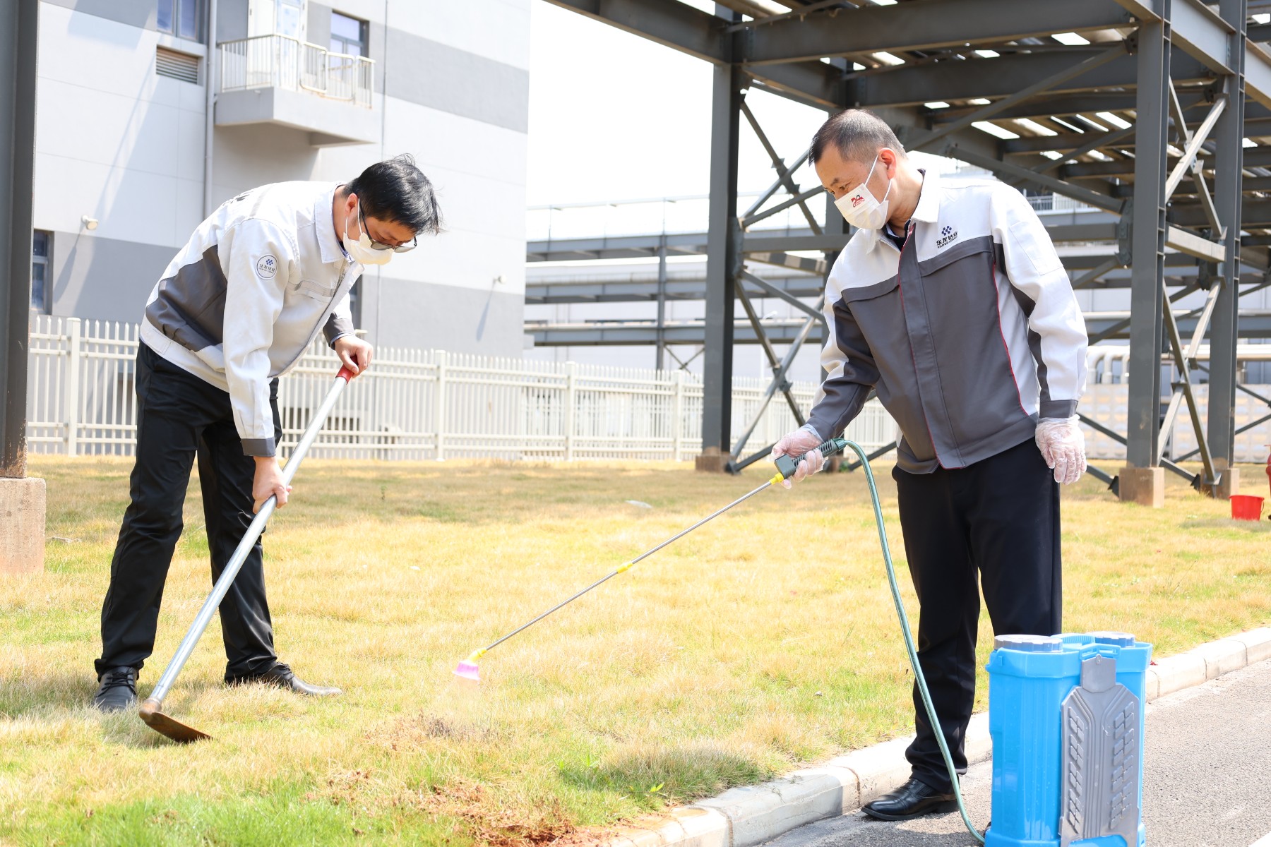 活動當(dāng)天,陽光明媚,廣西基地全體黨員及各部門參加人員匯聚在廠區(qū)內(nèi),分為三個小組5大區(qū)域開展清潔、清理與消殺工作。