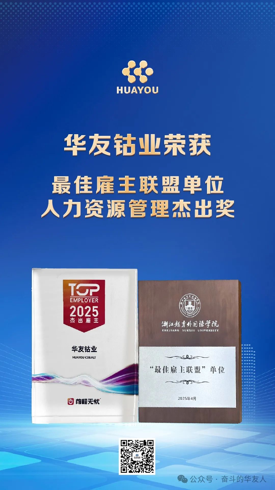 4月,華友鈷業憑借在人力資源領域的突破性探索與產教融合的標桿實踐,蟬聯兩項雇主榮譽——前程無憂"2025人力資源管理杰出獎"與浙江越秀外國語學院"最佳雇主聯盟"單位!這不僅是對公司“以人為本”核心價值的深度認可,更彰顯了華友鈷業以數字化革新組織生態、以校企協同培育全球競爭力的人才戰略格局。