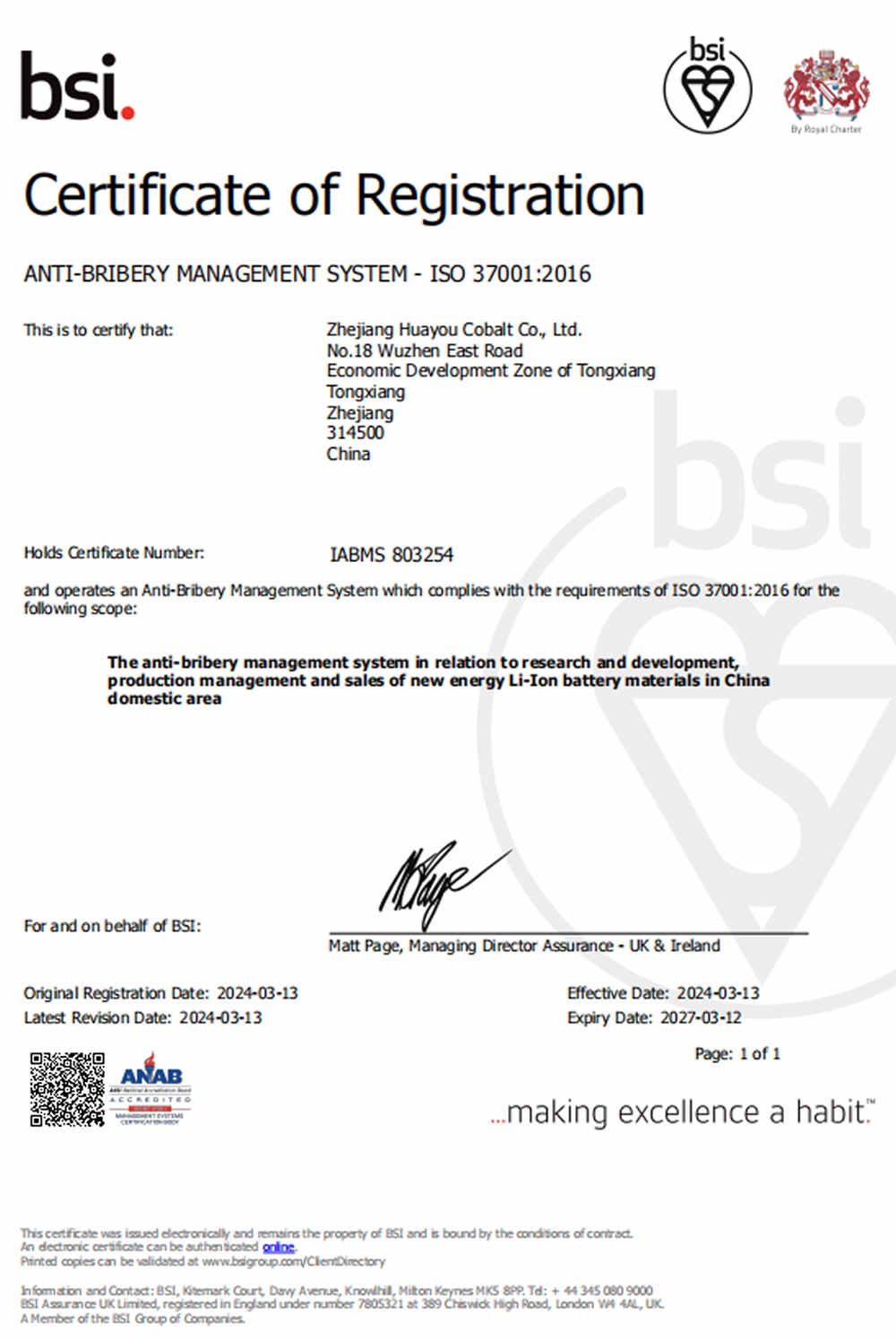 在英國標準協會BSI的審核下,華友鈷業通過反賄賂管理體系ISO37001:2016認證并獲得相關證書,成為行業內率先獲得ISO37001:2016認證的企業,在全球化合規治理上邁出重要步伐。