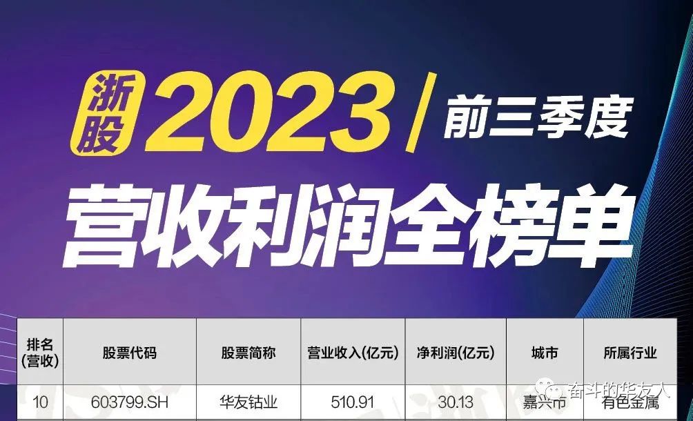 11月1日,浙商雜志公布浙江A股上市公司2023年前三季度營收、利潤全榜單,共有691家公司上榜。華友鈷業以510.91億元的營收、30.13億元的凈利潤雙雙位居第十,交上了一份高水平開放引領高質量發展的高分答卷!