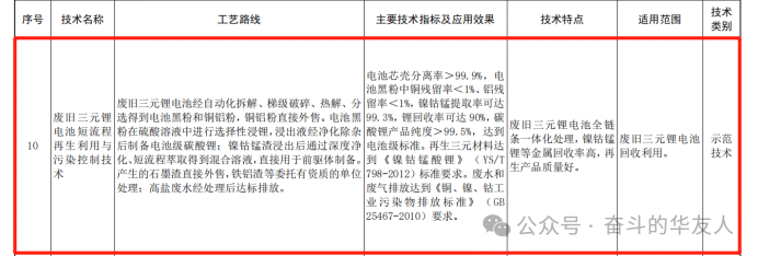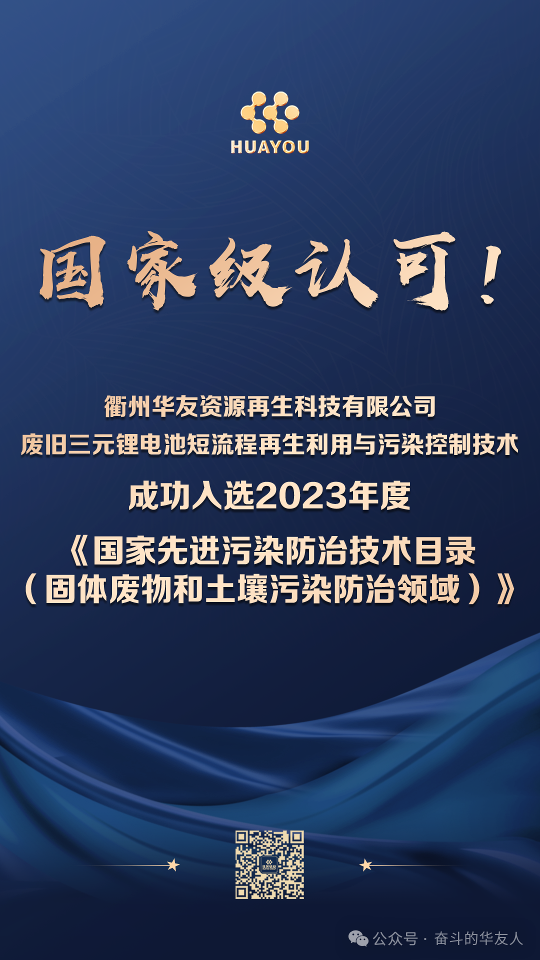 近日,衢州華友資源再生科技有限公司獨立研發技術——廢舊三元鋰電池短流程再生利用與污染控制技術,成功入選“三年一評選”的2023年度《國家先進污染防治技術目錄(固體廢物和土壤污染防治領域)》(以下簡稱《目錄》),三元鋰電回收領域全國僅兩家入選國家級固體廢物污染防治領域示范技術。