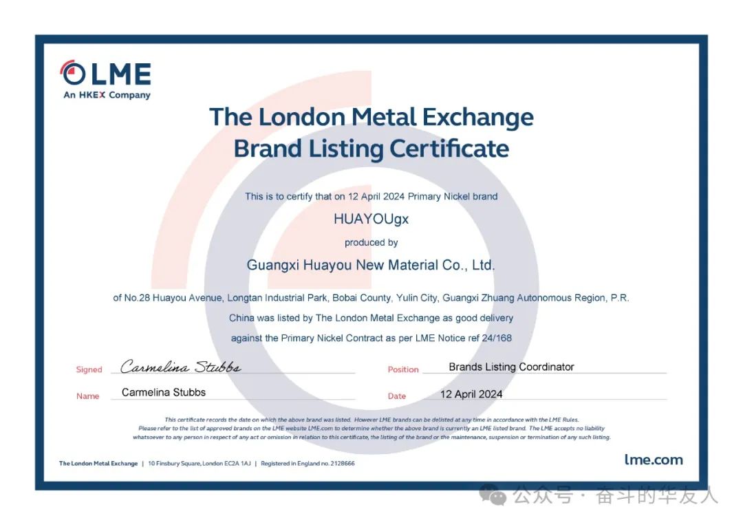 又一標志性成果!“HUAYOUgx”牌電解鎳在LME注冊成功