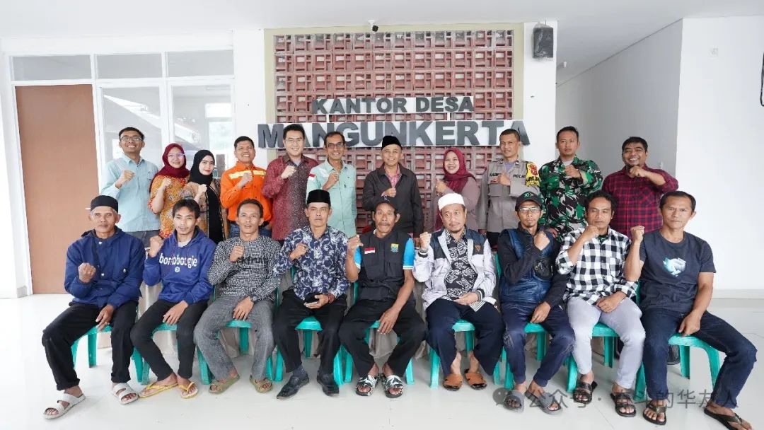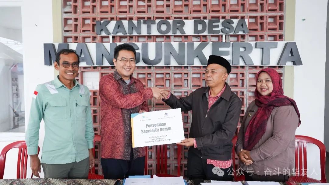 近日, 華友和印尼淡水河谷公司在西爪哇省吉安竹市Mangunkerta村辦事處舉行了供水項目一期交接儀式。儀式上,印尼淡水河谷副總裁Adriansyah Chaniago和華友印尼公共事務部部長甄德龍向Cibeureum村村長Asep Nahdoh和Mangunkerta村村長Ira頒發了捐贈證書。