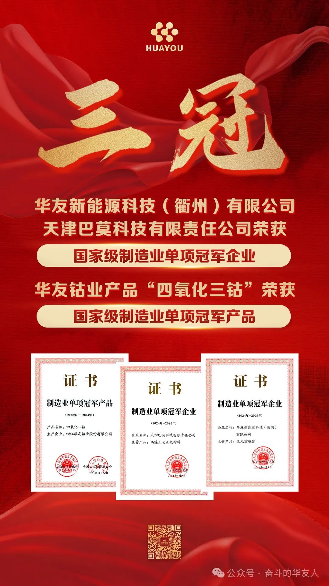 近日,華友鈷業(yè)旗下公司華友新能源科技(衢州)有限公司、天津巴莫科技有限責(zé)任公司雙雙獲得工信部正式頒發(fā)的“制造業(yè)單項(xiàng)冠軍企業(yè)”證書(shū)。此前,華友鈷業(yè)的“四氧化三鈷”已摘得“制造業(yè)單項(xiàng)冠軍產(chǎn)品”桂冠。