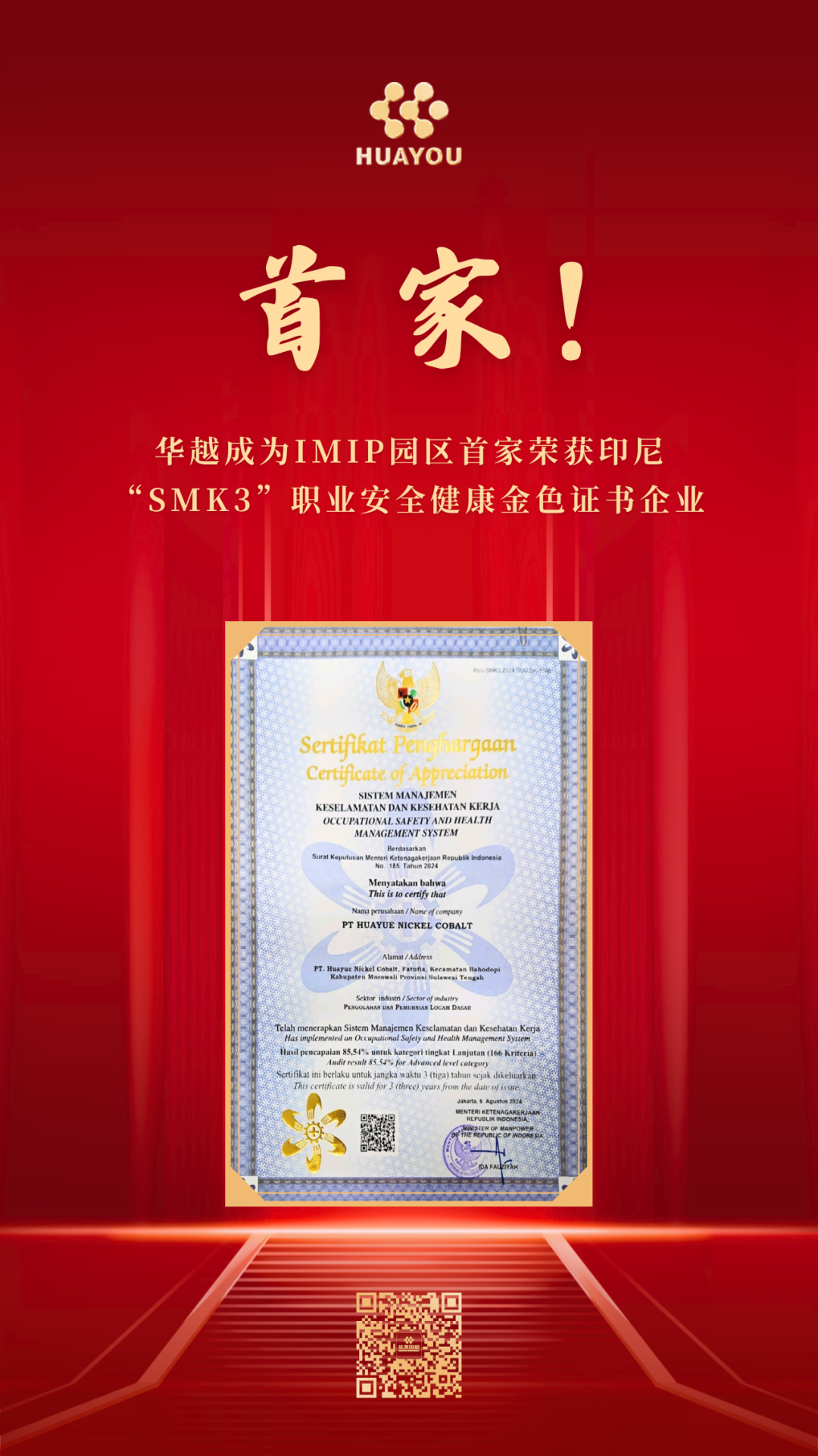 9月9日,華越鎳鈷(印尼)有限公司正式通過審核,獲得印尼勞工部頒發的“SMK3職業安全健康”金色(最高等級)證書,成為IMIP園區50多家企業中首家獲此認證的企業。