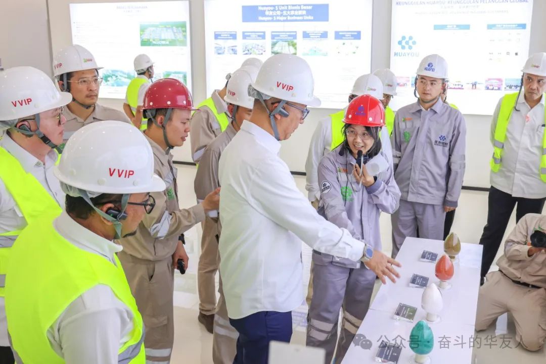 阿古斯·古米旺閣下先后參觀了華飛項目高壓酸浸車間、產品車間以及華能項目展廳、質量檢測中心、主控中心和生產車間,聽取了關于項目概況以及工藝技術、生產規模、產能產量、ESG建設等情況介紹,對華友在印尼一系列項目的成功落地投產表示祝賀。