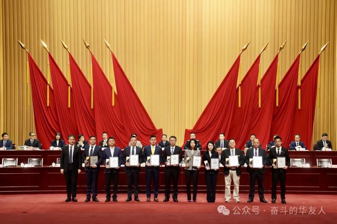 ▲華友鈷業(yè)高級副總裁王軍(右五)代表公司登臺領(lǐng)獎。