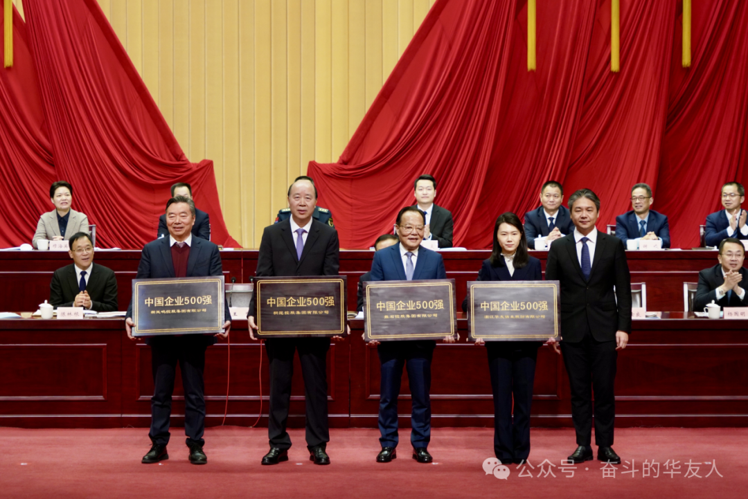 ▲桐鄉(xiāng)市委書記王堅為“中國企業(yè)500強”桐鄉(xiāng)上榜企業(yè)授牌,華友控股集團副董事長陳曉琳(右二)代表華友鈷業(yè)接受表彰。